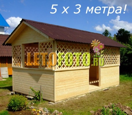 Дачная беседка из дерева 46 - описание:Недорогая дачная беседка правильной формы в виде дачного домика 5 х 3 метра.